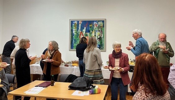 Die zahlreichen Teilnehmenden genossen noch lange nach dem gehaltvollen, inspirierenden Vortrag Arnold Mettnitzers den gemeinsamen Austausch bei einem guten Glas Wein.