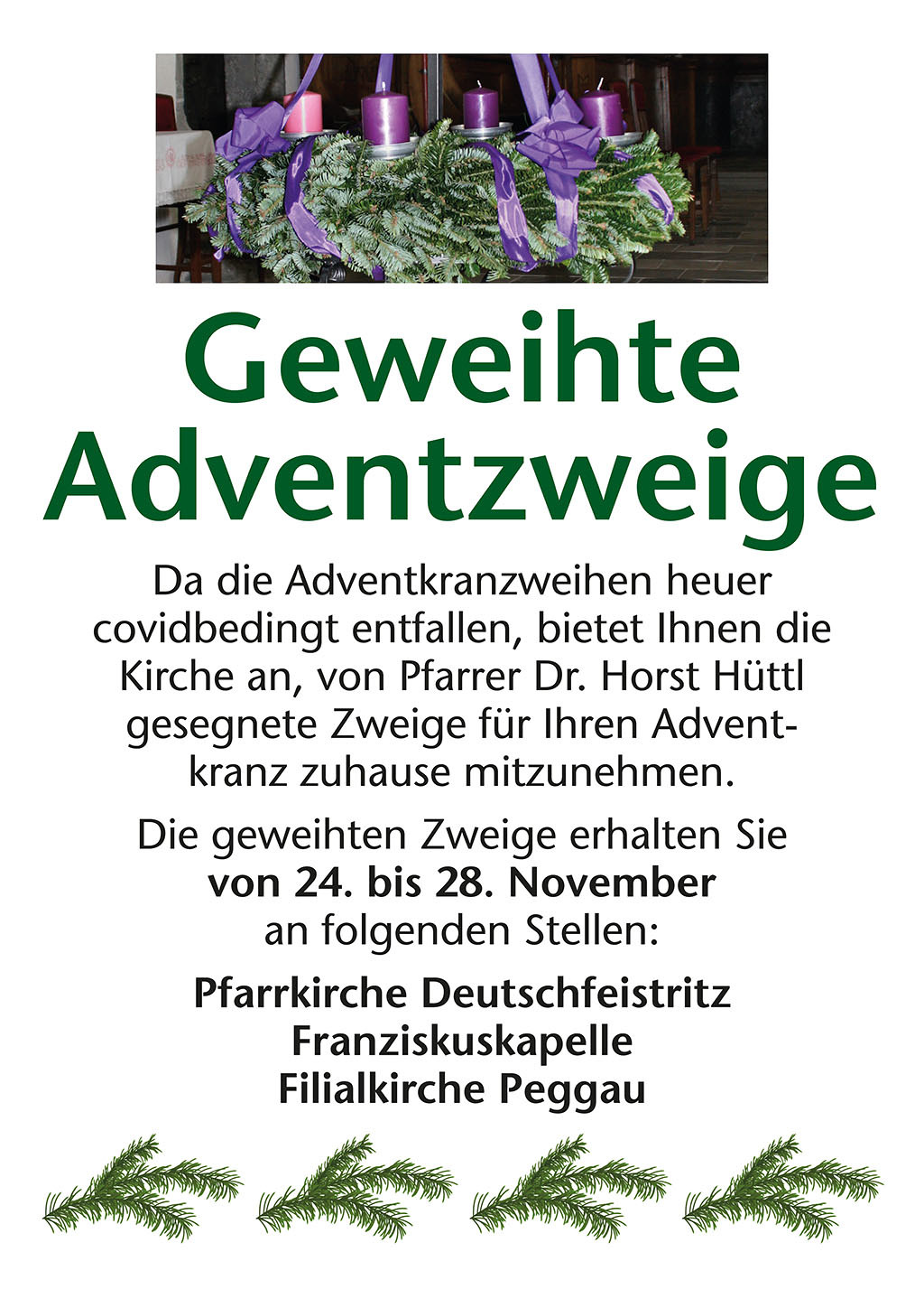 Kirche an, von Pfarrer Dr. Horst Hüttl gesegnete Zweige für Ihren Adventkranz nach Hause mitzunehmen.