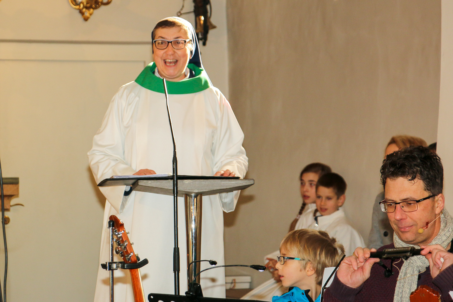 Drei Mütter sprachen bei der Predigt über die Themen aus dem Evangelium (Salz und Licht) und der Taufe. Bei der Taufe stehen drei Symbole im Mittelpunkt: Das Taufwasser, das weiße Kleid und die Taufkerze. Diese Taufkerze brachten die Kinder mit, um sie an der Osterkerze zu entzünden und so an ihre Taufe erinnert zu werden.