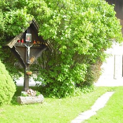 Dieses wunderbare Holzkreuz mit der Christusfigur steht zwischen dem Wohnhaus von Johann Fuchsbichler vlg. Hansbauer und Stall im Hofbereich, umgeben von schönen Flieder-, Jasmin- und Wacholdersträuchen.