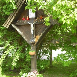 Das hölzerne Kreuz besteht aus zwei sich rechtwinkelig schneidende Balken, das Satteldach ist mit Schindeln gedeckt und über dem Corpus ist farbiges Bild von Maria mit dem Jesuskind angebracht. Im Christentum wurde das Kreuz durch den Kreuzestod Christi zum Sinnbild des Leidens und seiner Auferstehung. Am Fuße dieses religiösen Zeichen dient ein kurzer ausgehöhlter Baustamm als Blumenkistchen. Dieses Kreuz wurde vermutlich deswegen aufgestellt, da ohne Glauben an Christus und die Schöpfung kein Hof komplett ist.