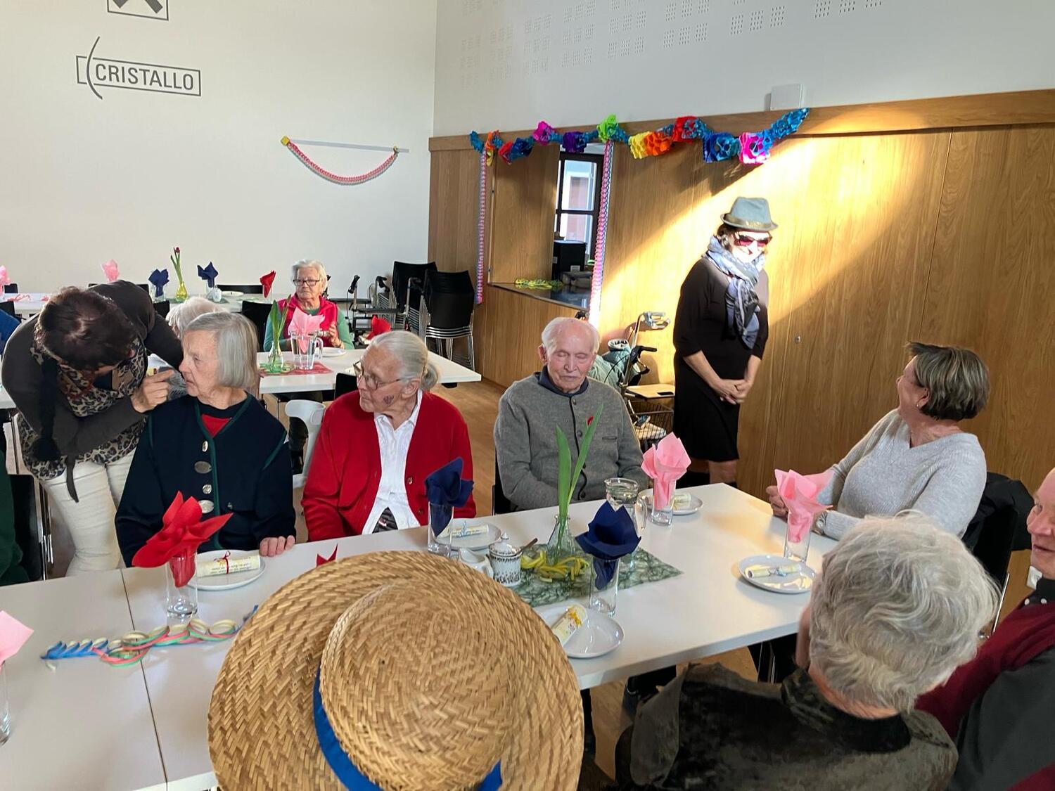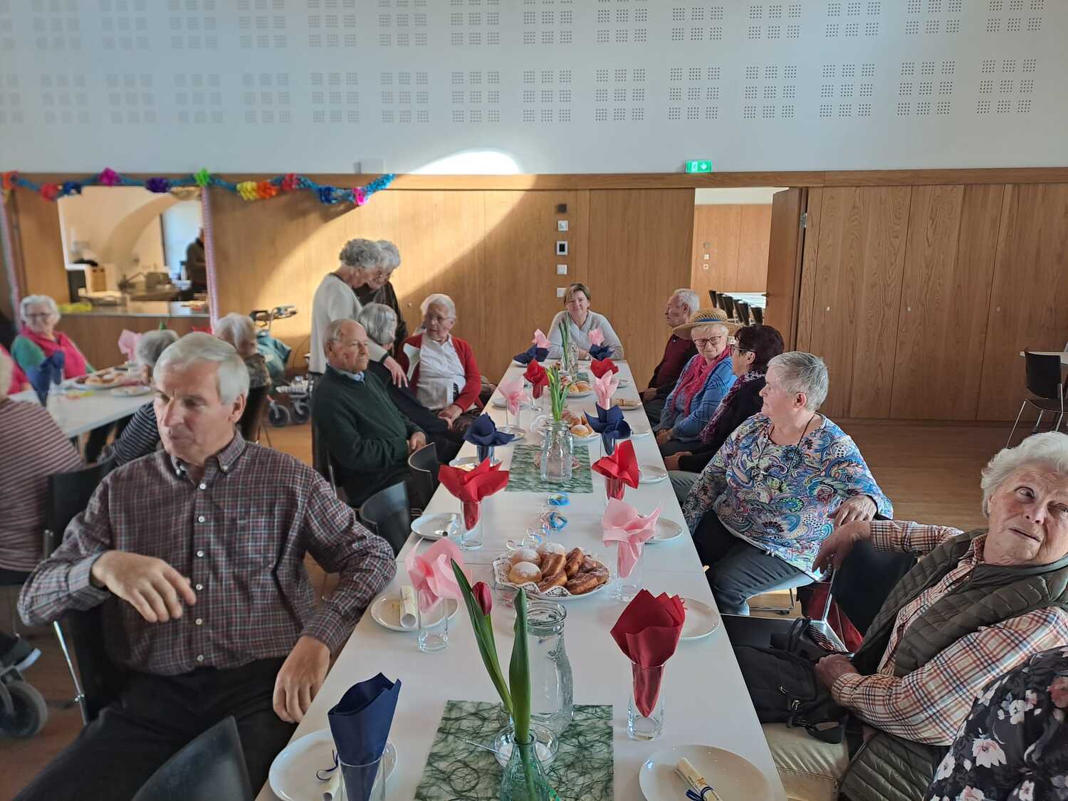 Die fleißigen Hände vom Pfarrgemeinderat und unserem Team des Begegnungsnachmittags haben den Saal wunderbar geschmückt und einige haben Krapfen und Strauben für die Besucher gebacken.