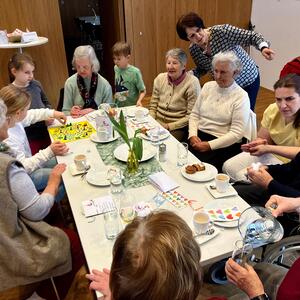 Frau Michaela Moser und Frau Susanne Schreiner überraschten die anwesenden Senioren heute mit dem Besuch einiger Kinder aus der Nachmittagsbetreuung. Der Raum war gefüllt mit lebendiger und fröhlicher Stimmung. Beim gemeinsamen Spielen mit Jung und Alt wurde viel geplaudert und gelacht. Die Kuchenteller leerten sich rasch und bei Kaffee, Wein und gesponserten Säften, waren alle Gäste bestens versorgt.