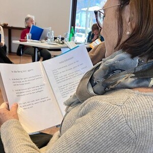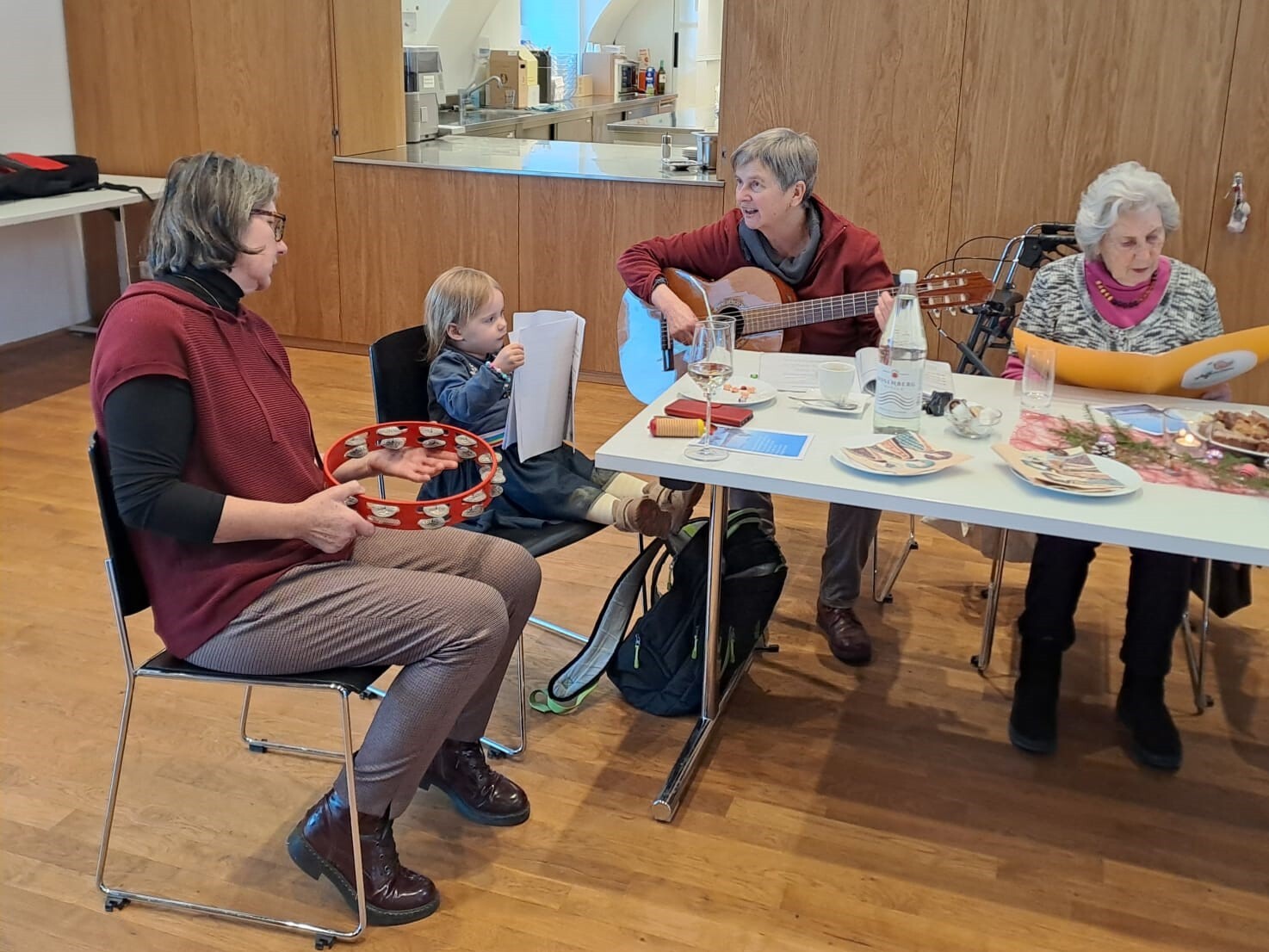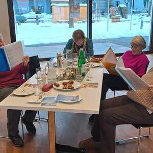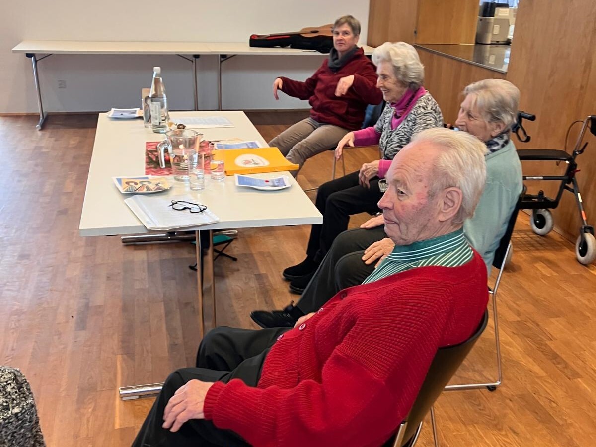 Bei einem Gläschen Wein, Kaffee und hausgemachten Mehl­spei­sen wur­den dann auch einige alt­bekan­nte Lie­der ge­sun­gen. Regina Dietrich be­glei­te­te die Sänger:­innen auf der Gitarre und die mit­ge­brach­ten Texte ver­lei­te­ten die Gäste zum Mit­singen.