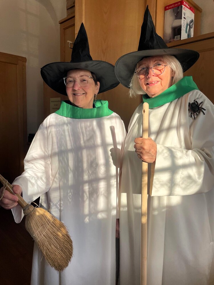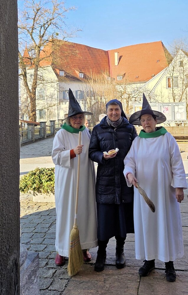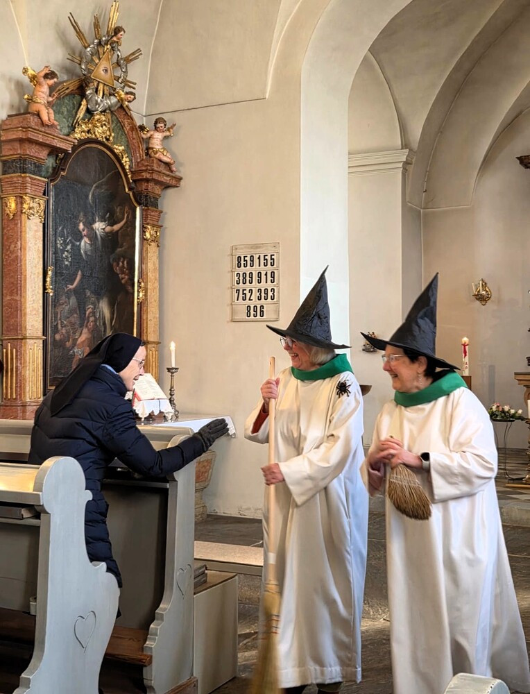 Susanne Linhardt und Margret Hofmann leiteten die heutige Wort-Gottes-Feier am Faschingsonntag in Dobl. “Jeder kehre vor seiner eigenen Tür!“ – die Besen sind gut sichtbar. Fotos sehen Sie weiter unten und auf der Fotogalerie der Pfarre Dobl.